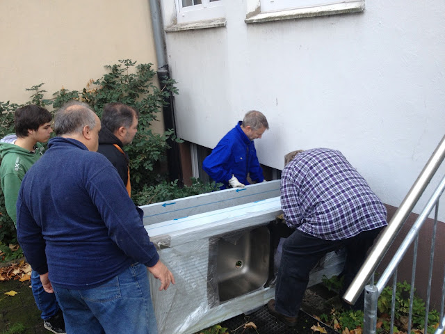 Man denkt nicht, dass die Spüle überhaupt durch so ein enges Kellerfenster durchpasst. Wenn nicht, hätte unser Küchenbauer echt kreativ werden müssen.