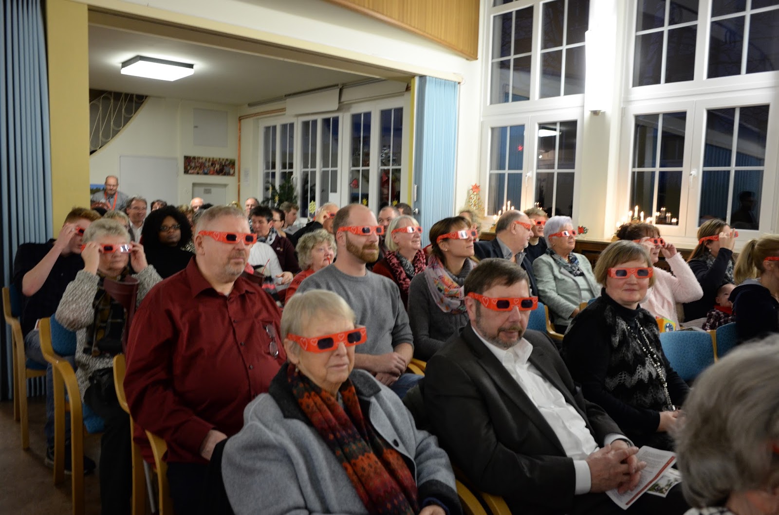 Geschenke für die Kinder gab es auch. Alle haben übrigens einen Sitzplatz gefunden, wenn auch auf Tischen und Fensterbänken. Aber das war ja schon in biblischen Zeiten so. Und das haben die Leute durch die Spezialbrillen gesehen: