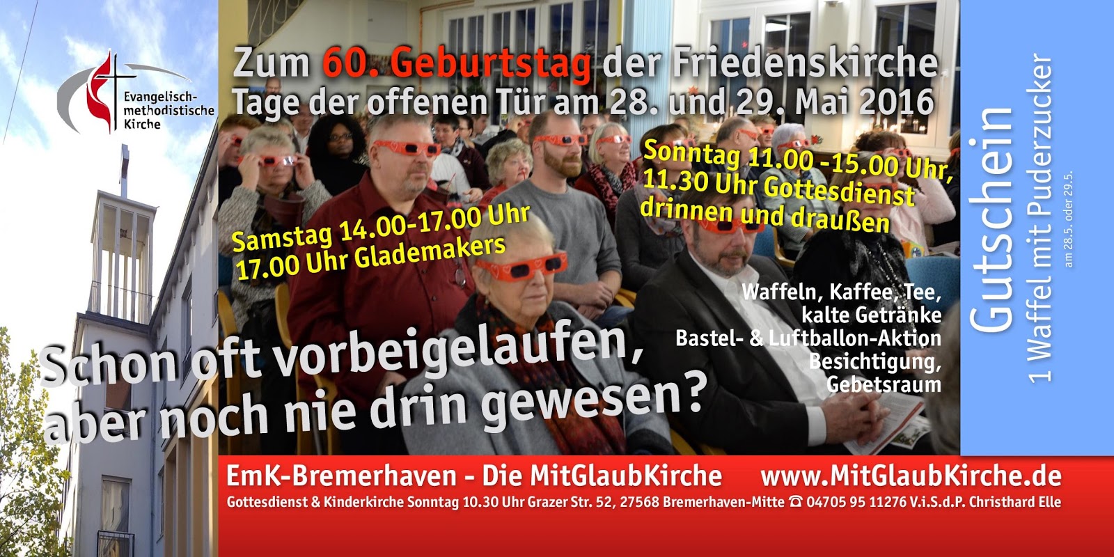 Sonntag starten wir mit einem Gottesdienst drinnen und draußen um 11.30 Uhr und haben bis 15.00 Uhr geöffnet. Es gibt Waffeln, Kaffee, Tee, kalte Getränke, eine Bastel- und Luftballonaktion und eine Gebetsecke mit 4 Stationen. Und natürlich darf man alles anschauen. Alle sind herzlich willkommen!