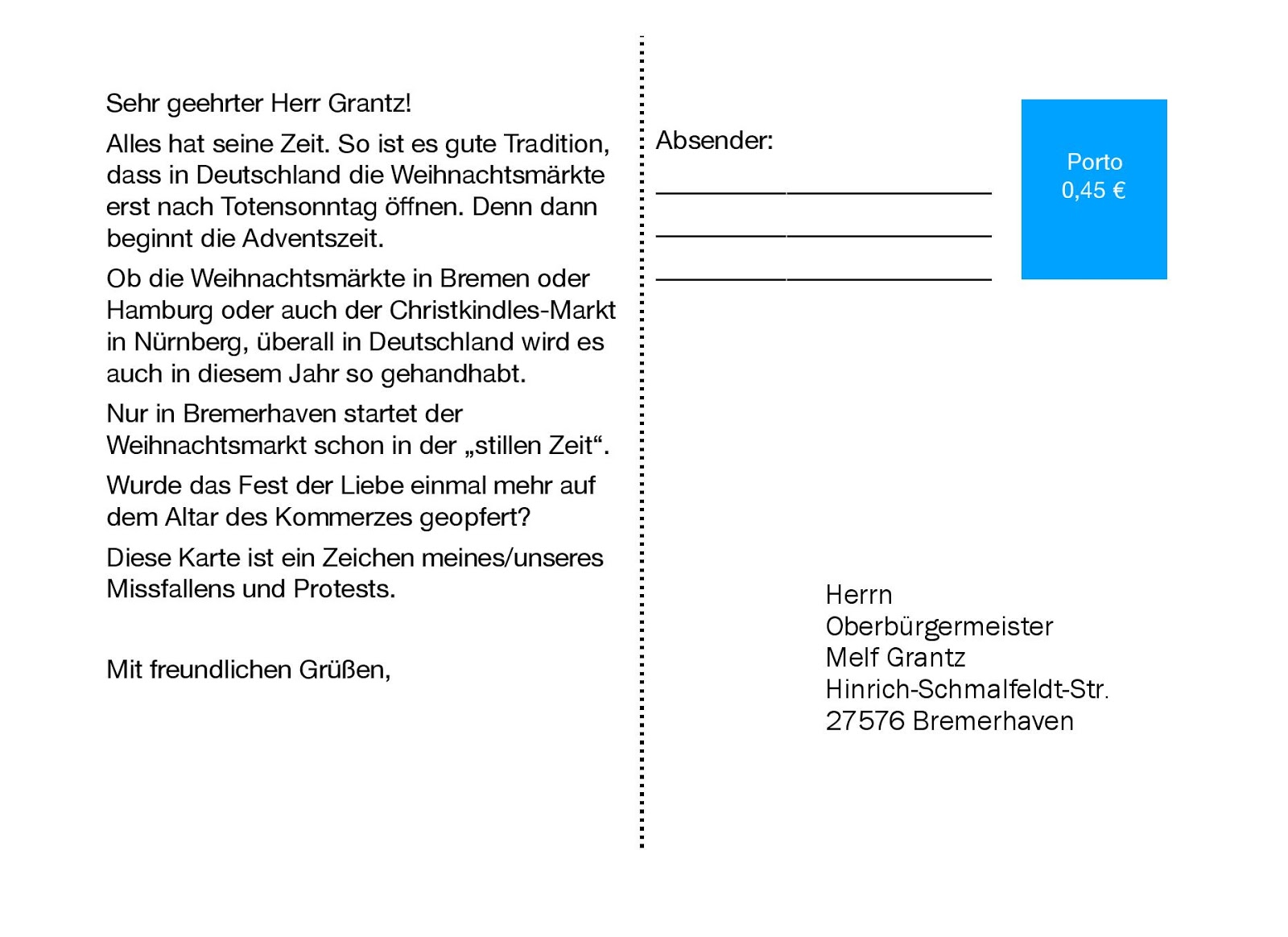 Wir haben 5000 Postkarten gedruckt. Jede und jeder, der sich unserem Protest anschließen möchte, ist eingeladen, eine dieser Postkarten an unseren Oberbürgermeister zu schicken. Bist du dabei? Danke!
