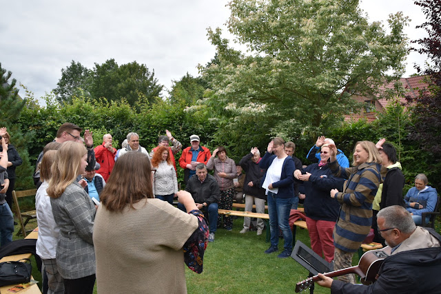 …und es wurde trotzdem ein sehr fröhlicher 1. Sommerkirchensonntag. Nach einem Gottesdienst mit Abendmahl und Regenunterbrechung wurde gemeinsam gegrillt. Über 50 waren gekommen – wenn es nur nicht so kalt gewesen wäre. Da kann es die nächstem drei Sommerkirchen-Sonntage nur wärmer werden.